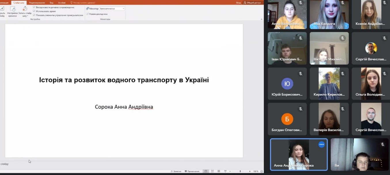 В засіданні гуртка взяли участь студенти першого курсу групи МТ-103 Б. Тема засідання – «Історія та розвиток транспортної системи України». З доповідями виступили: Латиговський О.О. «Історія та розвиток авіаційного транспорту в Україні», Сорока А. А. «Історія та розвиток водного транспорту в Україні», Ковріга К. А. «Історія та розвиток залізничного  транспорту в Україні», Хандога Я.М. «Історія та розвиток автомобільного транспорту в Україні».