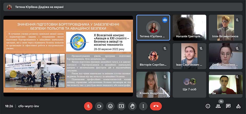 Присутніми були 18 здобувачів вищої освіти 1-3 курсів, які навчаються за ОПП «Мультимодальний транспорт і логістика» та «Бортовий супровід авіаційних пасажирських перевезень». З доповідями виступили 15 гуртківців. Кожен з виступаючих звітував про власні здобутки, а також ознайомив з планами на майбутнє щодо подальших власних досліджень за обраною темою, вносилися пропозиції щодо розвитку загальної науково-дослідницької діяльності гуртка на наступний рік.
