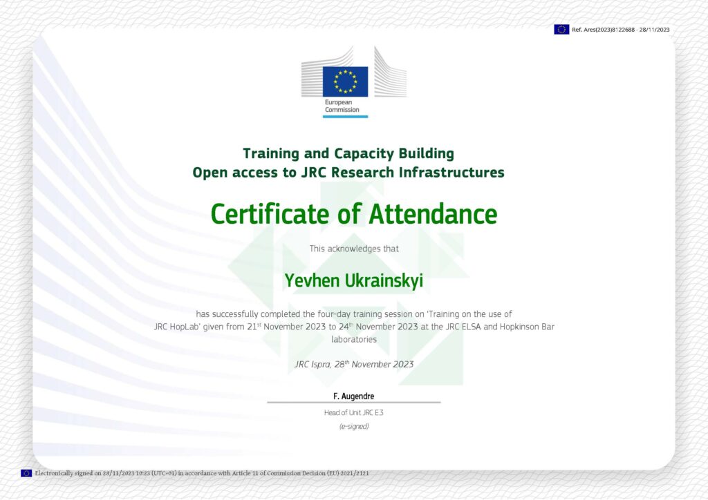 На запрошення Об’єднаного Дослідницького Центру Європейської Комісії від 6 жовтня 2023 р. доцент кафедри організації авіаційних робіт та послуг Український Євген Олександрович пройшов стажування у Joint Research Centre ELSA HopLab в м. Іспра, Італія з 21.11.2023 р. по 24.11.2023 р., як учасник міжнародного проєкту Horizon «Обмін європейським досвідом у сфері науки в процесі інтеграції України-Грузії з Європейським Союзом» («Sharing European experience in the field of science in the process of integration of Ukraine-Georgia with the European Union»).