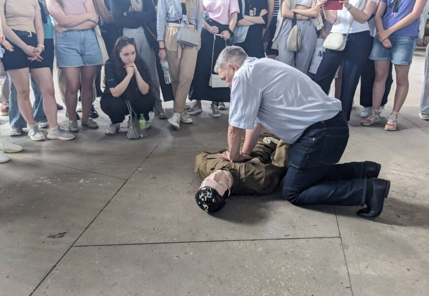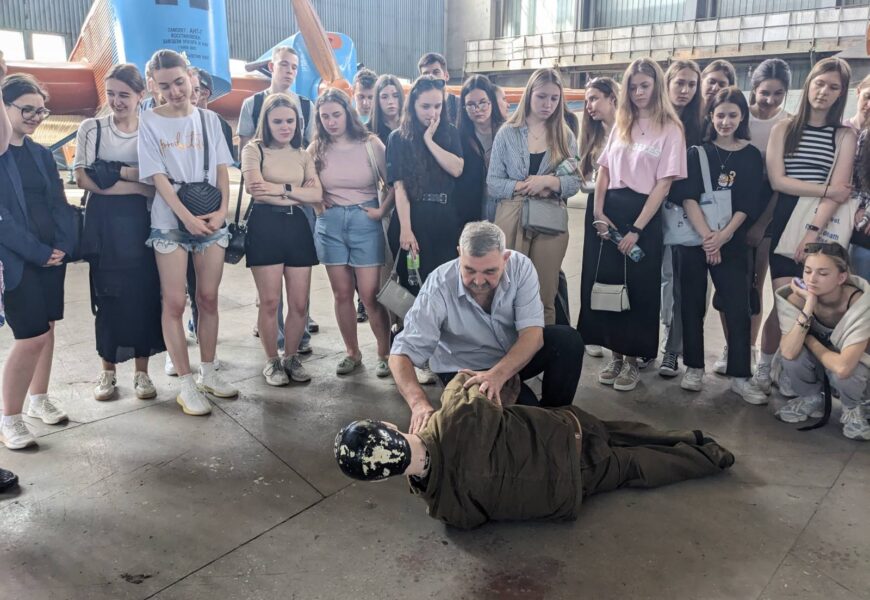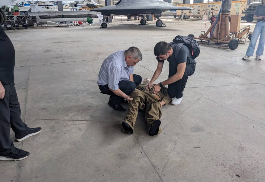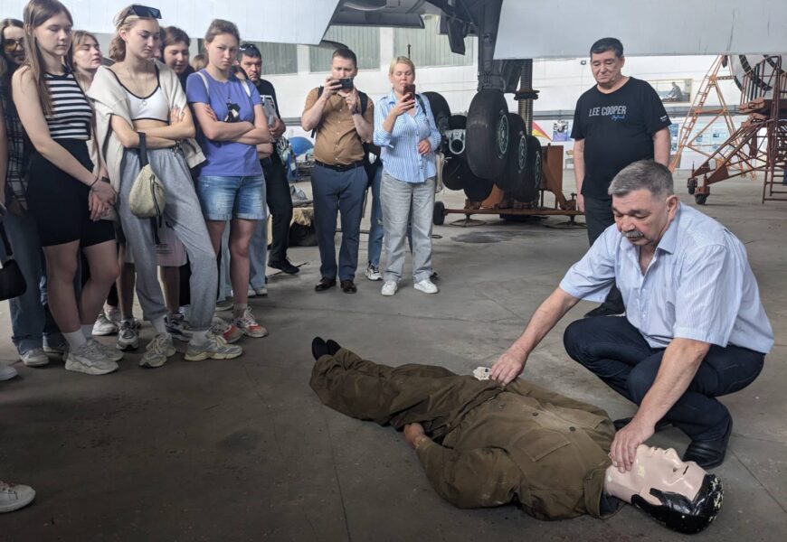 04 червня 2024 року здобувачі 2го та 3го курсів кафедри організації авіаційних робіт та послуг ОПП «Бортовий супровід авіаційних пасажирських перевезень» та «Мультимодальний транспорт і логістика» в рамках організаційно-технологічної практики пройшли практичний тренінг в ангарі НАУ з професійним інструктором-медиком – кандидатом медичних наук, професором Халмурадовим Б.Д. щодо процедури надання невідкладної медичної допомоги на борту ПС у випадку екстреної ситуації.