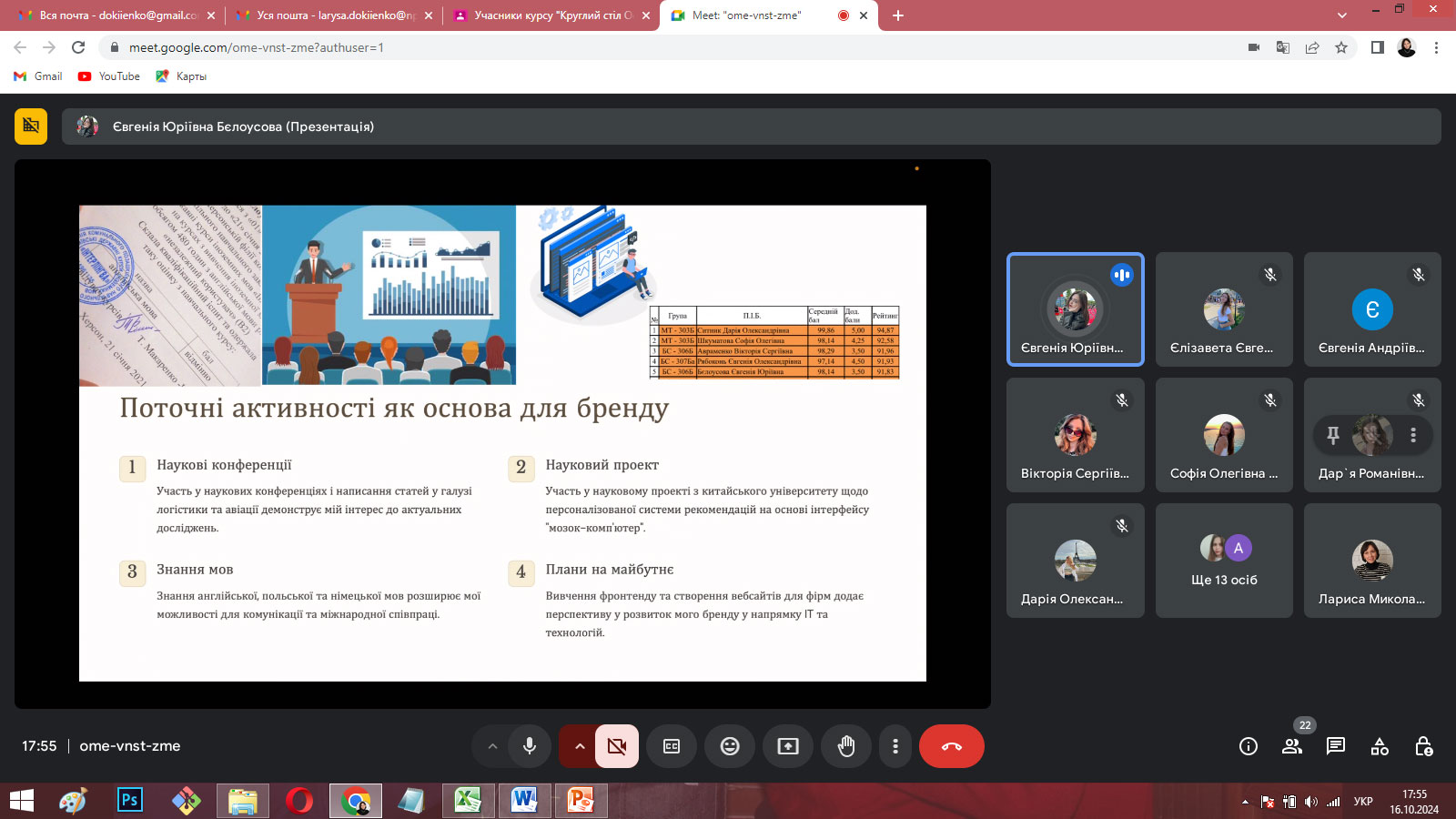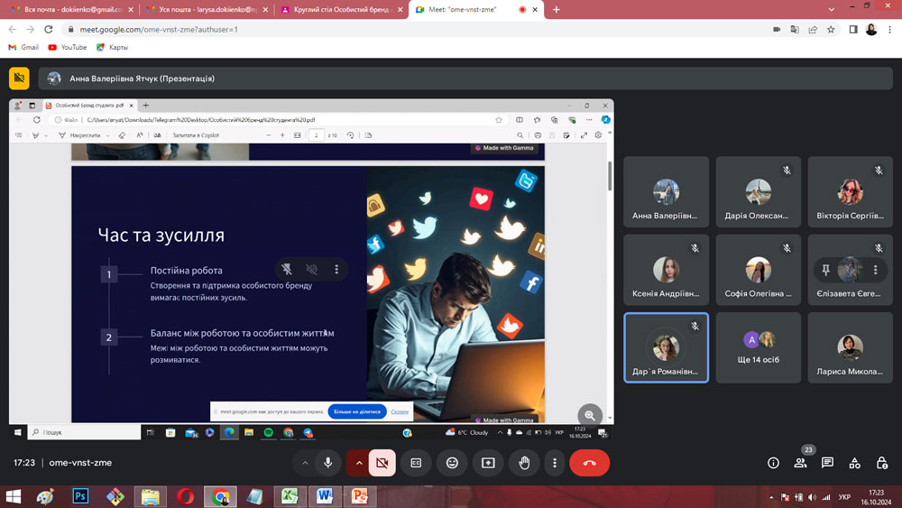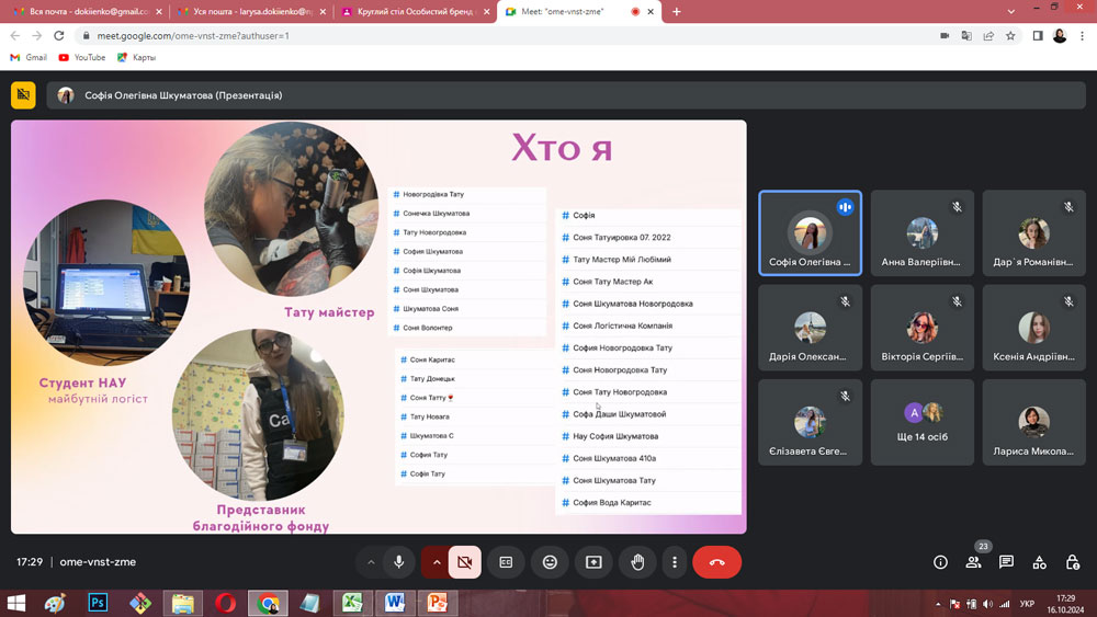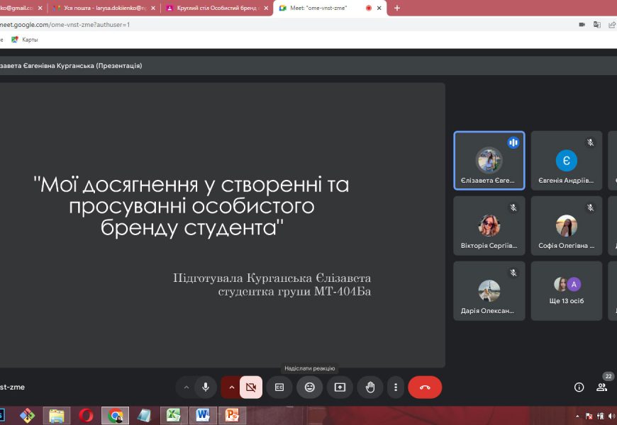 З презентаціями своїх досягнень у різних видах діяльності та досвіді формування особистого бренду виступили Дар’я СИТНИК (4 курс), Софія ШКУМАТОВА (4 курс), Єлизавета КУРГАНСЬКА (4 курс), Вікторія АВРАМЕНКО (4 курс), Євгенія БЄЛОУСОВА (4 курс) та Анна ТИМОШЕНКО (4 курс). Євгенія МАЗУР (2 курс) розглянула етапи побудови особистого бренду на власному прикладі, а Анна ЯТЧУК та Дар’я ІВАСЕНКО (3 курс) зупинилися на мінусах і труднощах формування та просування особистого бренду здобувача.