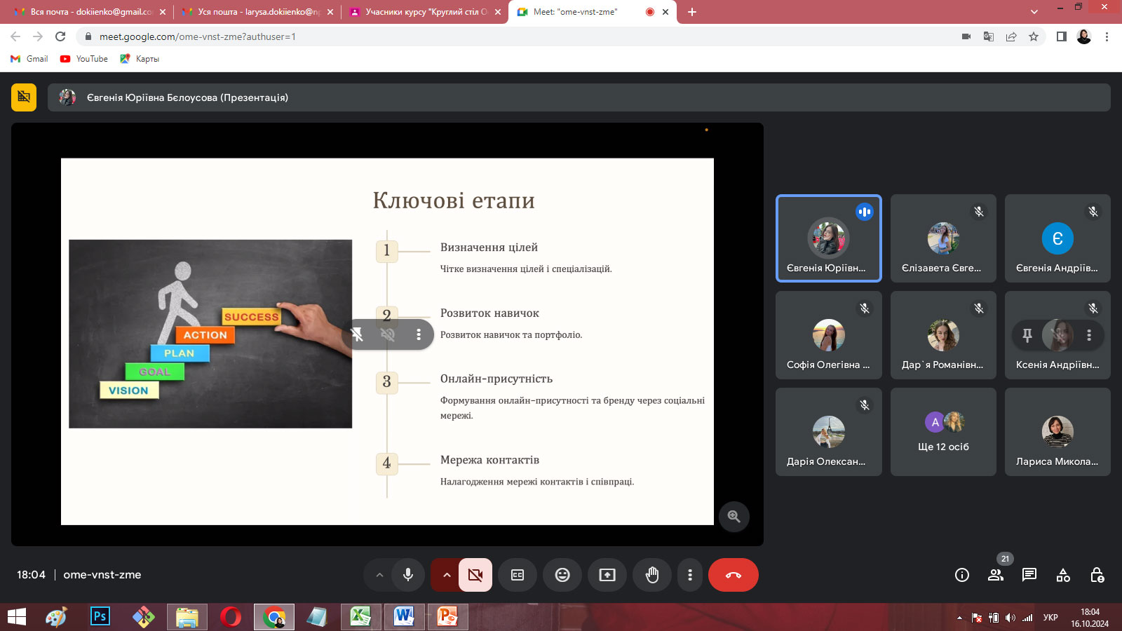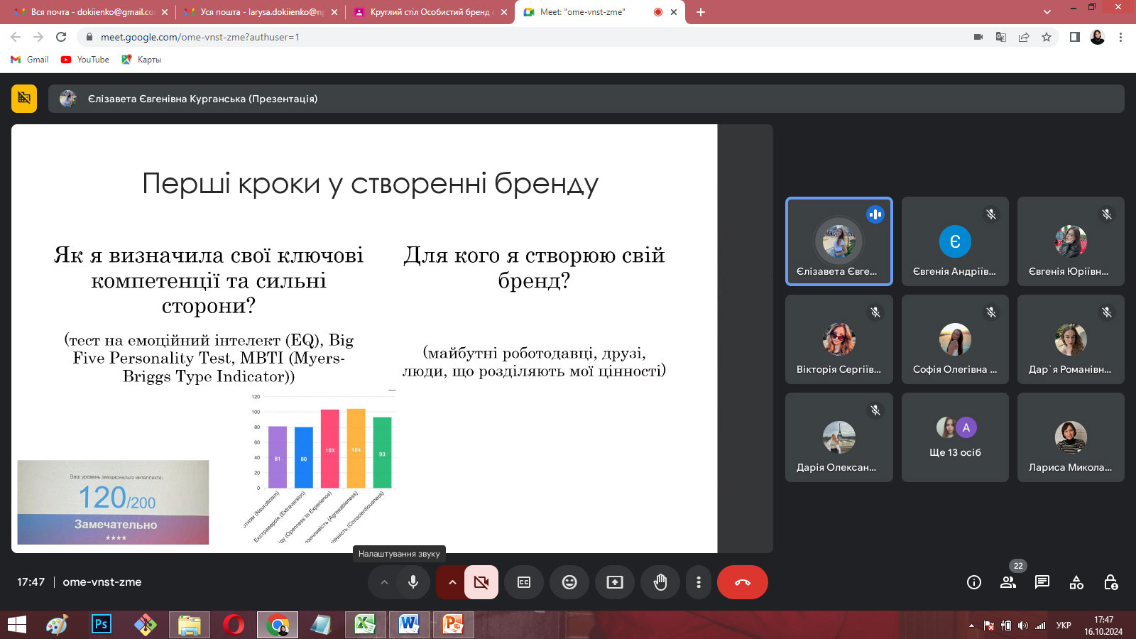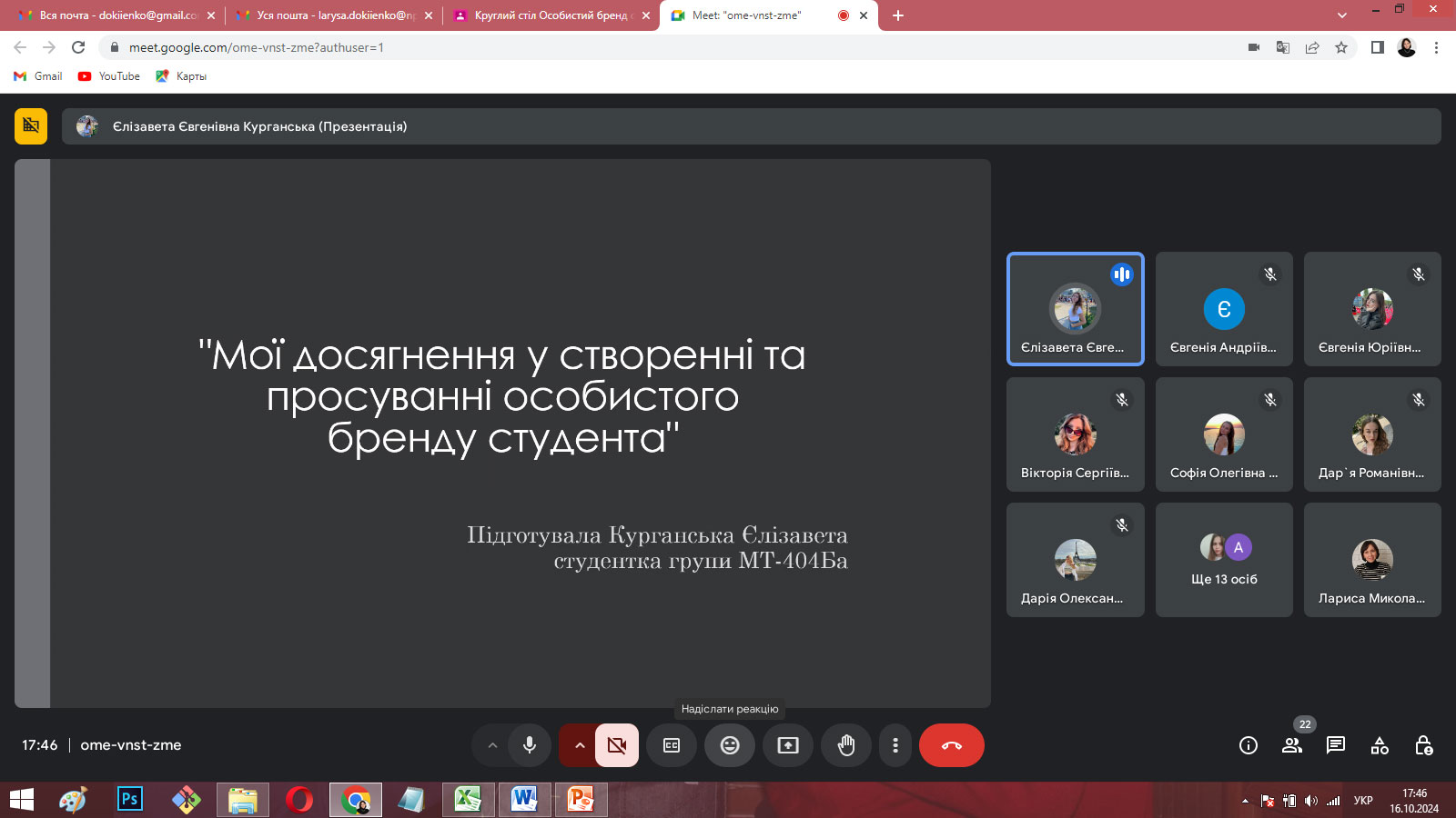 З презентаціями своїх досягнень у різних видах діяльності та досвіді формування особистого бренду виступили Дар’я СИТНИК (4 курс), Софія ШКУМАТОВА (4 курс), Єлизавета КУРГАНСЬКА (4 курс), Вікторія АВРАМЕНКО (4 курс), Євгенія БЄЛОУСОВА (4 курс) та Анна ТИМОШЕНКО (4 курс). Євгенія МАЗУР (2 курс) розглянула етапи побудови особистого бренду на власному прикладі, а Анна ЯТЧУК та Дар’я ІВАСЕНКО (3 курс) зупинилися на мінусах і труднощах формування та просування особистого бренду здобувача.