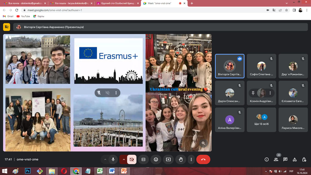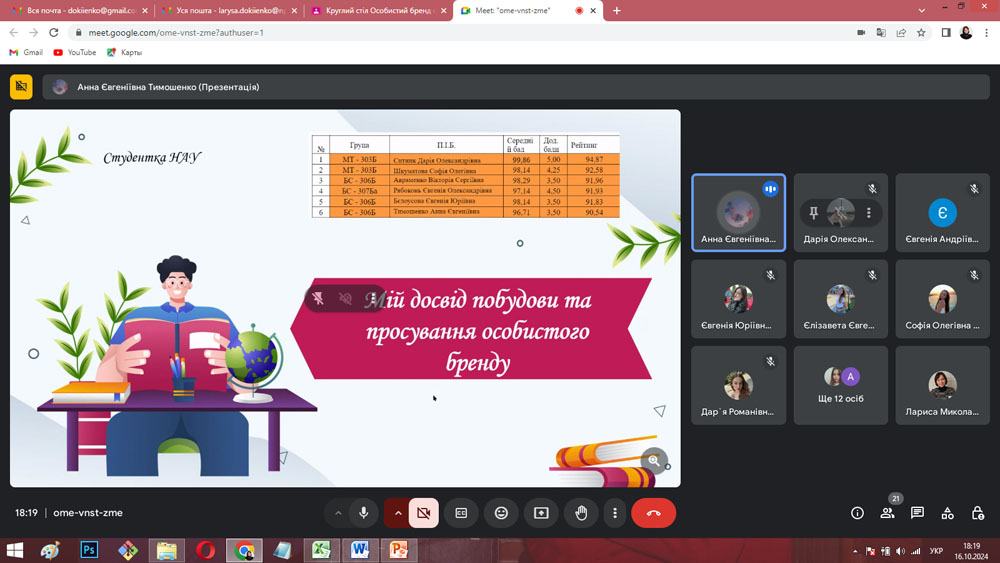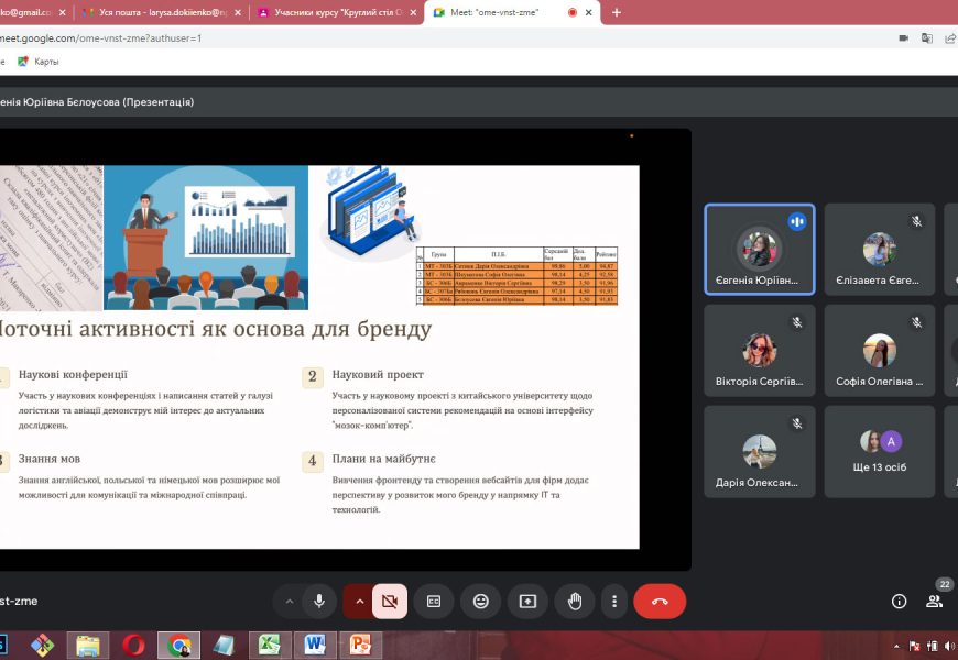 16 жовтня 2024 року на кафедрі організації авіаційних робіт і послуг за ініціативи та під керівництвом доцента Лариси ДОКІЄНКО відбулося засідання 2-го Круглого столу з циклу «Особистий бренд студента» на тему: «Мій досвід створення та просування особистого бренду», у якому взяли участь 22 здобувачі кафедри організації авіаційних робіт та послуг 1-4 курсів ОПП «Мультимодальний транспорт і логістика» та «Бортовий супровід авіаційних пасажирських перевезень».