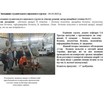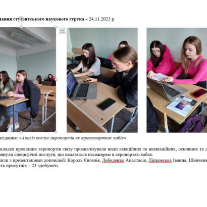13 жовтня 2023 року відбулось чергове засідання наукового гуртка «Інфраструктура мультимодальних перевезень» під керівництвом доцента кафедри організації авіаційних робіт і послуг Лариси Докієнко, яке було присвячене аналізу тенденцій та перспектив розвитку авіатранспортних послуг в Україні та світі (у…